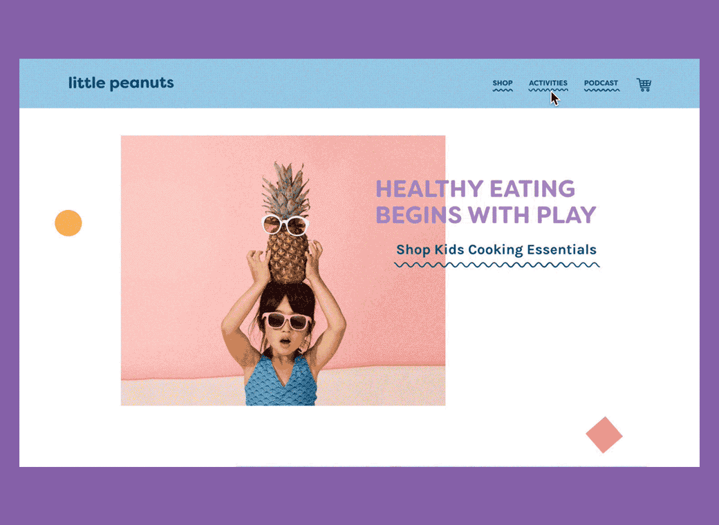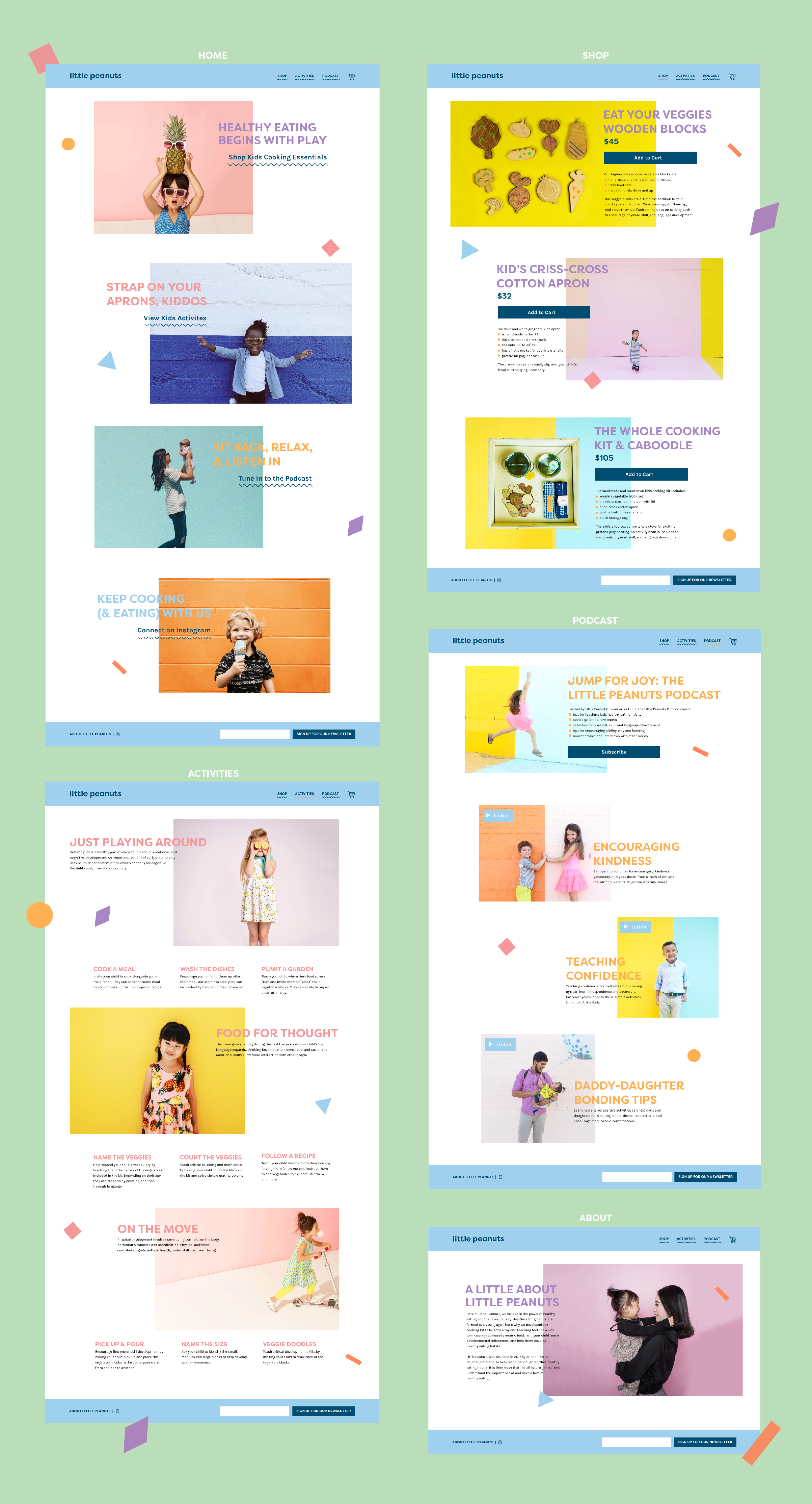Little Peanuts' online presence is an extension of the colorful and playful nature of the brand and cooking kit. The shapes of the hang tags are sprinkled throughout the background of the website, wavy lines from the blocks are used to indicate links, and subtle animations create surprising and delightful interactions. New content is posted regularly to encourage return visits.