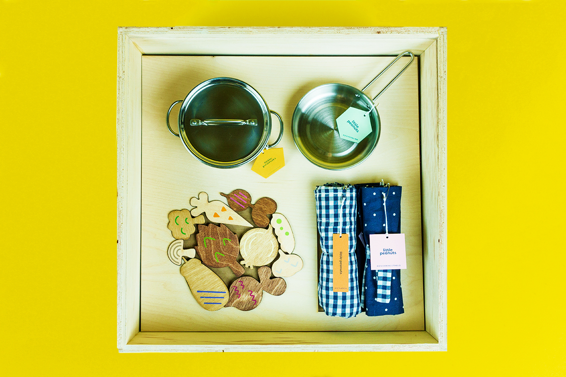 Little Peanuts believes healthy eating begins with play. We designed a children’s cooking kit that encourages pretend play, skill development, and curiousity around food. The kit includes a set of handmade wooden vegetable and utensil blocks, stainless steel pot and pan, apron, tool rool, and block storage bag. An activity book is included to help parents facilitate lessons on counting, vocabulary, following directions, and more. A portion of every purchase supports early childhood nutrition education programs.