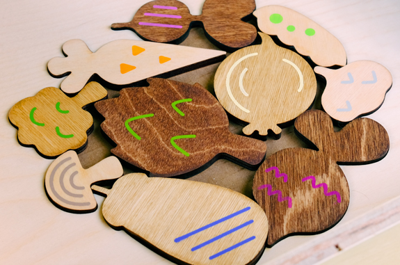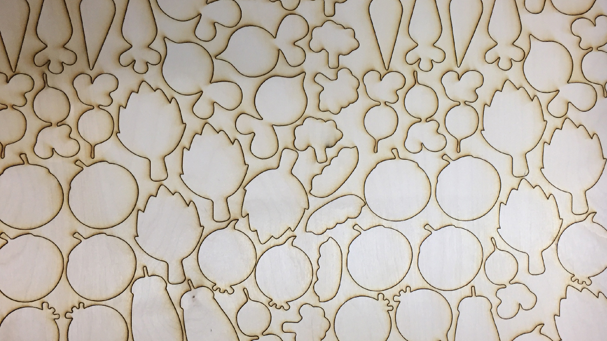 Blocks for the Little Peanuts Cooking Kit were cut with a 75W Epilog Helix laser cutter at the Boulder Library Makerspace. The block patterns were cut on a Roland GS-24 vinyl cutter, which was used as a stencil for paint application. They were handstained with Minwax wood finish and sealed with a water-based polycrylic for food safety. The apron, tool roll and block storage bag were made with 100% cotton fabric on a Janome sewing machine.